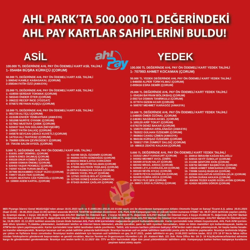 Milli Piyango İdaresi Genel Müdürlüğü’nden alınan 18.01.2023 tarih ve E-24951361-255.01.02-31168 sayılı izni ile düzenlenen kampanyanın Ahlatcı Otomotiv İnşaat ve Sanayi Ticaret A.Ş. adına 20.01.2023 (Saat 10.00) – 30.06.2023 (Saat 22.00) tarihleri arasında MUCİZE TANITIM tarafından düzenlenen AHL Park AVM Kampanyası’nda en yüksek katılım numarası 975867 ‘dır. 08.07.2023 tarihinde yapılan çekilişte, ikramiye olarak, 1 kişiye 100.00,00 TL değerinde AHLPAY Markalı Ön Ödemeli Kart, 2 kişiye 50.000,00 TL değerinde AHLPAY Markalı Ön Ödemeli Kart, 4 kişiye 25.000,00 TL değerinde AHLPAY Markalı Ön Ödemeli Kart, 10 kişi 10.000,00 TL değerinde AHLPAY Markalı Ön Ödemeli Kart, 20 kişi 5.000,00 TL değerinde AHLPAY Markalı Ön Ödemeli Kart ikramiyesi kazanmıştır. AHLPAY Markalı Ön Ödemeli Kartlar, 15.08.2023 -31.12.2023 tarihleri arasında Çorum ilinde bulunan AHL Park AVM içerisindeki mağazalarda geçerli kullanabileceklerdir. Kartın içerisindeki tutar Ahlatcı kuyumculuk, AHL Park AVM içerisindeki döviz işlemleri, TL/dakika yüklemeleri, mobil/sabit telefon ve internet fatura ödemeleri, alkollü içecekler, şans ve talih oyunları harcamaları, tütün ve tütün mamülleri için kullanılmayacak, banka ve ATM’lerden işlem yapılmayacaktır. Kartın içerisindeki tutar talihli tarafından nakde çevrilemez. Talihli, söz konusu kartlara yüklenen bakiyeyi ATM’lerden nakit olarak çekemeyecek, bir başka banka hesabına transfer edemeyecektir. İkramiye kazanan asil ve yedek talihliler yukarıda belirtilmiştir. İkramiye kazanan asil ve yedek talihlilere taahhütlü posta yolu ile bildirim yapılacaktır. İkramiye tesliminde bilgisayar çıktısı ve fiş/fatura ibrazı zorunludur. İkramiyeyi teslim alabilmek için kazanan asil talihlilerin en geç 26.07.2023, yedek talihlilerin en geç 10.08.2023 tarihine kadar, 0212 275 18 07 No.lu faksa nüfus cüzdan fotokopilerini göndererek başvurmaları ve gerekli evrakları, Mucize Tanıtım ve Organizasyon Hizmetleri Ltd. Şti. Atakent Mah. 221 Sok. Rota Office No: 3A D: 16 Küçükçekmece/İstanbul adresine kargo ile göndermeleri gerekmektedir. İkramiye son teslim tarihi 31.12.2023’ dür. ÖTV ve KDV haricindeki diğer tüm yasal yükümlülükler talihlilere aittir. Kampanyaya katılan herkes kampanya kurallarını peşinen kabul etmiş sayılır.
