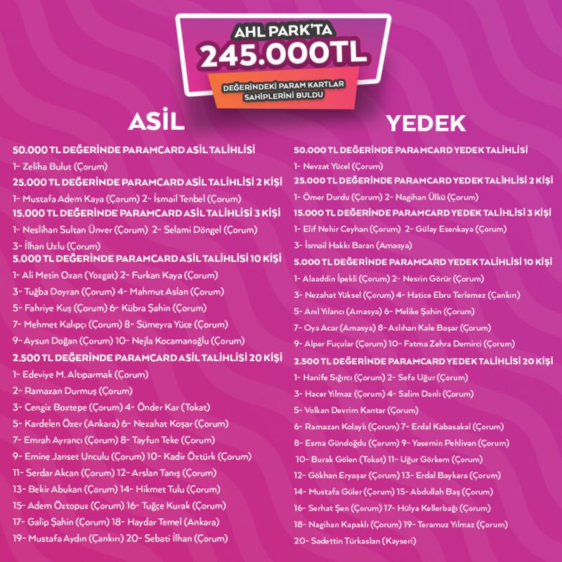 Genel EtkinliklerParam Kart Talihlileri Belli Oldu ! 12 EylAhl Park’ın dev çekilişi sahiplerini buldu. Katılan herkese teşekkür ediyor, iyi alışverişler diliyoruz. Ahl Park’tan Hes Kodlu Anahtarlık Hediye!13 Kasım’da Yumurta Boyama Atölyesi Ahl Park AVM’de